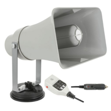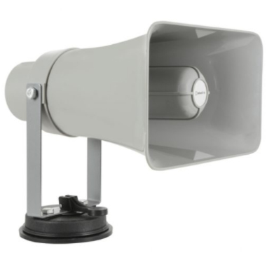 Active horn speaker with adjustable bracket and removable suction cup base for attaching to a vehicle roof. Power is connected via a 12V cigar lighter lead, delivering up to 25W power output. A detachable handset houses a push-to-talk microphone along with all controls and connectors for other functions. The top of the handset has ports for USB and SD media to allow audio playback and a 3.5mm auxiliary line input for external audio sources. An integral record function enables a speech message to be recorded up to 120 seconds and played back as a loop. Siren and whistle alerts can be activated by push buttons and, an inbuilt Bluetooth receiver enables wireless connection to a smart phone for playback of audio files or as a remote microphone via various available Bluetooth Microphone apps. Designed for mobile announcements or permanent installation for public address or alerts.