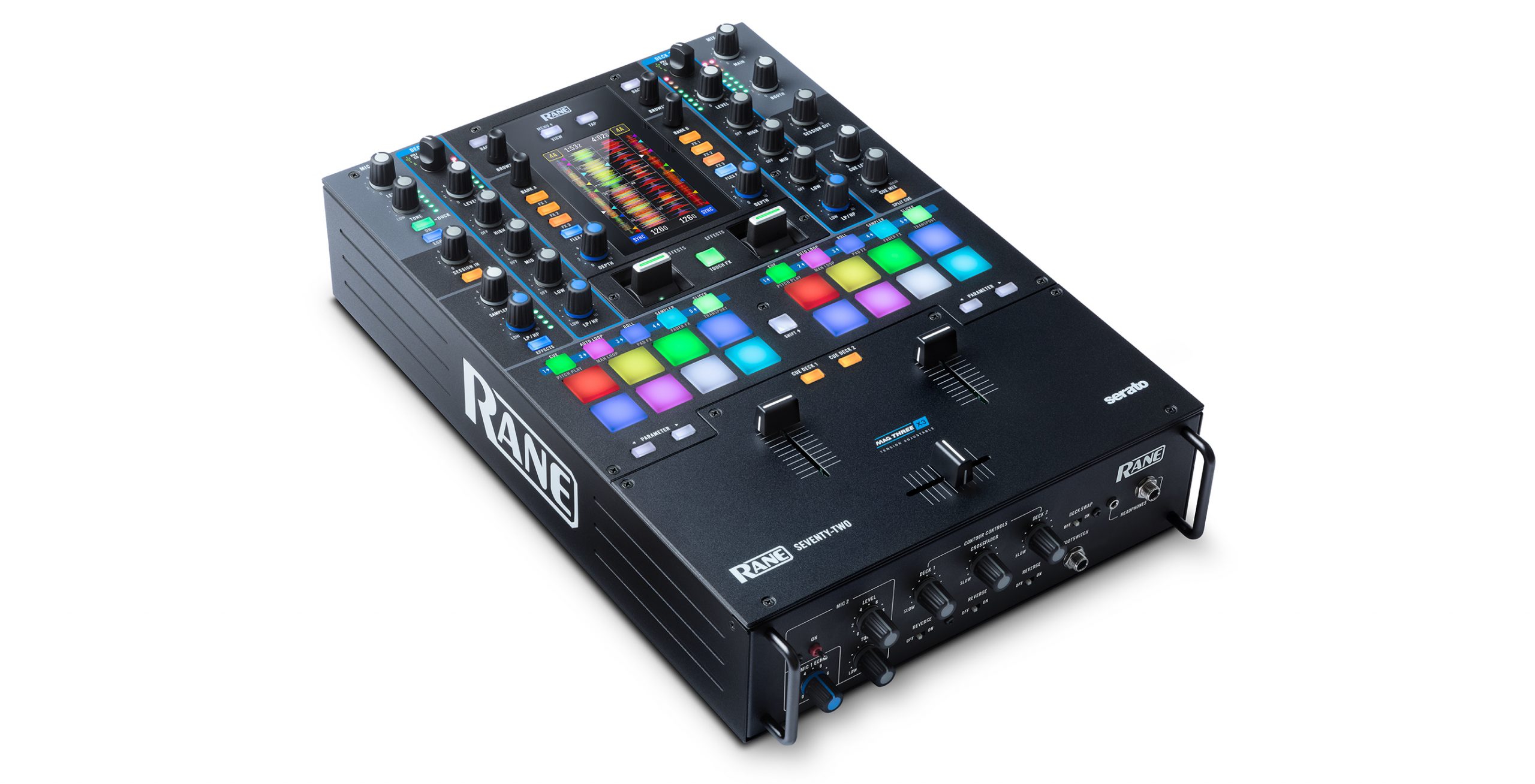 Powered by the all-new Serato DJ Pro software, the Seventy-Two’s 4.3" color touch-screen interface visualizes its moving waveforms, enabling navigation, track selection and extensive performance preference adjustment too. It also offers full FX control and sonic manipulation utilizing and stacking the Seventy-Two’s dual Flex FX engines with Serato DJ Pro’s extensive and expressive effects banks. Two DJ’s can perform simultaneously and handover effortlessly via the unit’s dual-USB connections. Turntablists can cut, flare, chirp, crab, orbit and transform with the new, tactile and precision based Mag Three faders, then flip between expressive control functions via the 16 MPC-style pads with RGB backlight and multi-performance mode selections. Also, Serato’s expressive Pitch ‘n Time DJ expansion is included free with the Seventy-Two, for DJs to integrate creative ‘pitch-play’ techniques into the mix.