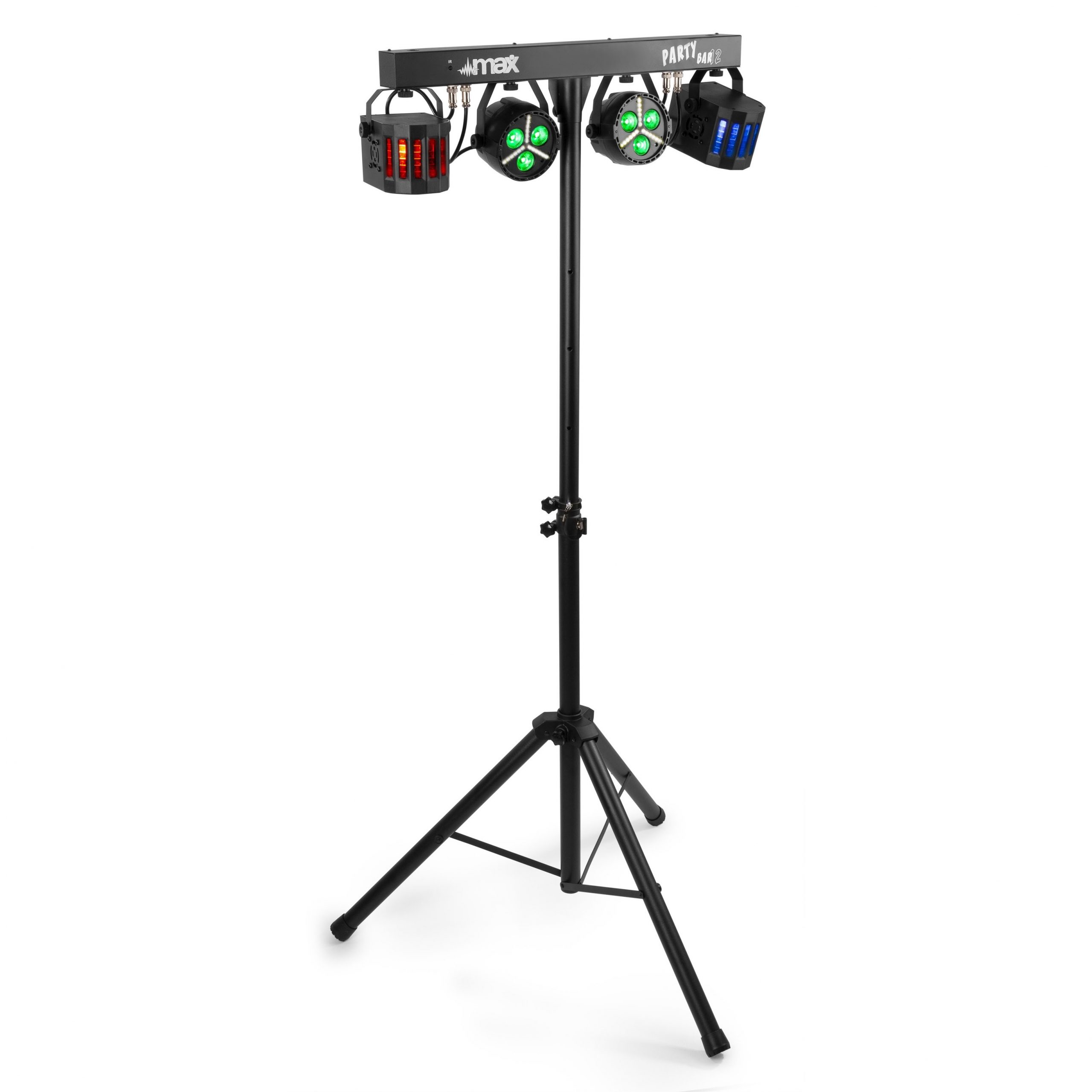 The MAX PartyBar Series consists of a number of complete kits fitted with spectacular LED light effects. All sets are provided with high-intensity LEDs in different colours. This series of Party Bars is plug and play and can be controlled via DMX, IR remote control or auto and sound-activated programs selectable from the control panel with LED display and push buttons. A tripod stand is included for quick and easy setup. Specially designed for stages, parties, entertainers and all other special events.