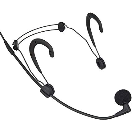 The microphone features a durable, low-profile wire frame headband which is fully adjustable for stability and comfort. A plastic carrying case protects the microphone and its accessories.