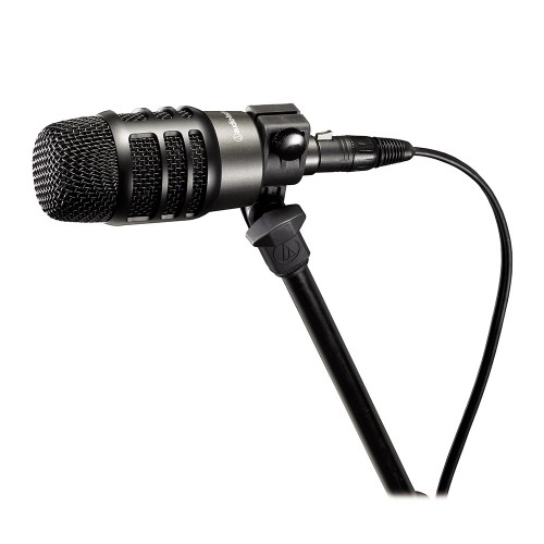 The ATM250DE dual-element instrument microphone features cardioid condenser and hypercardioid dynamic capsules combined in a single housing. Audio-Technica?s innovative use of two polar patterns is ideal for kick drum: the hypercardioid dynamic element focuses tightly on the aggressive attack of the beater, while the condenser captures the round tonalities of the shell. The elements are positioned in a perfect phase relationship, something practically impossible to achieve with two separate microphones. Includes a professional isolation clamp to provide secure mounting, versatile positioning and effective dampening of unwanted mechanical noise.