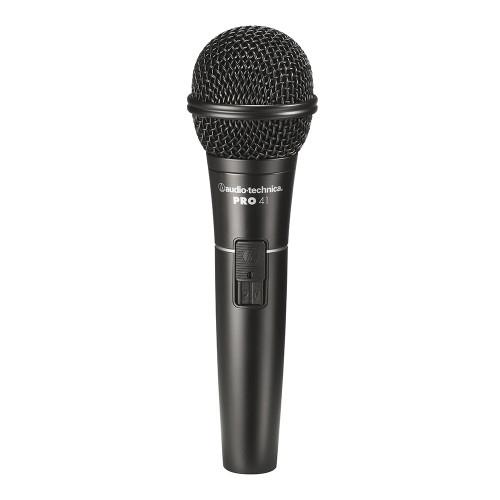 The Audio-Technica PRO 41 is a rugged handheld cardioid dynamic microphone optimized for capturing speech and vocals in rehearsals, public address, or onstage. Its frequency response is optimized for enhanced intelligibility of vocals. The PRO 41 features a dynamic element with a high-output neodymium magnet, which contributes to achieving high output levels with low noise floor.