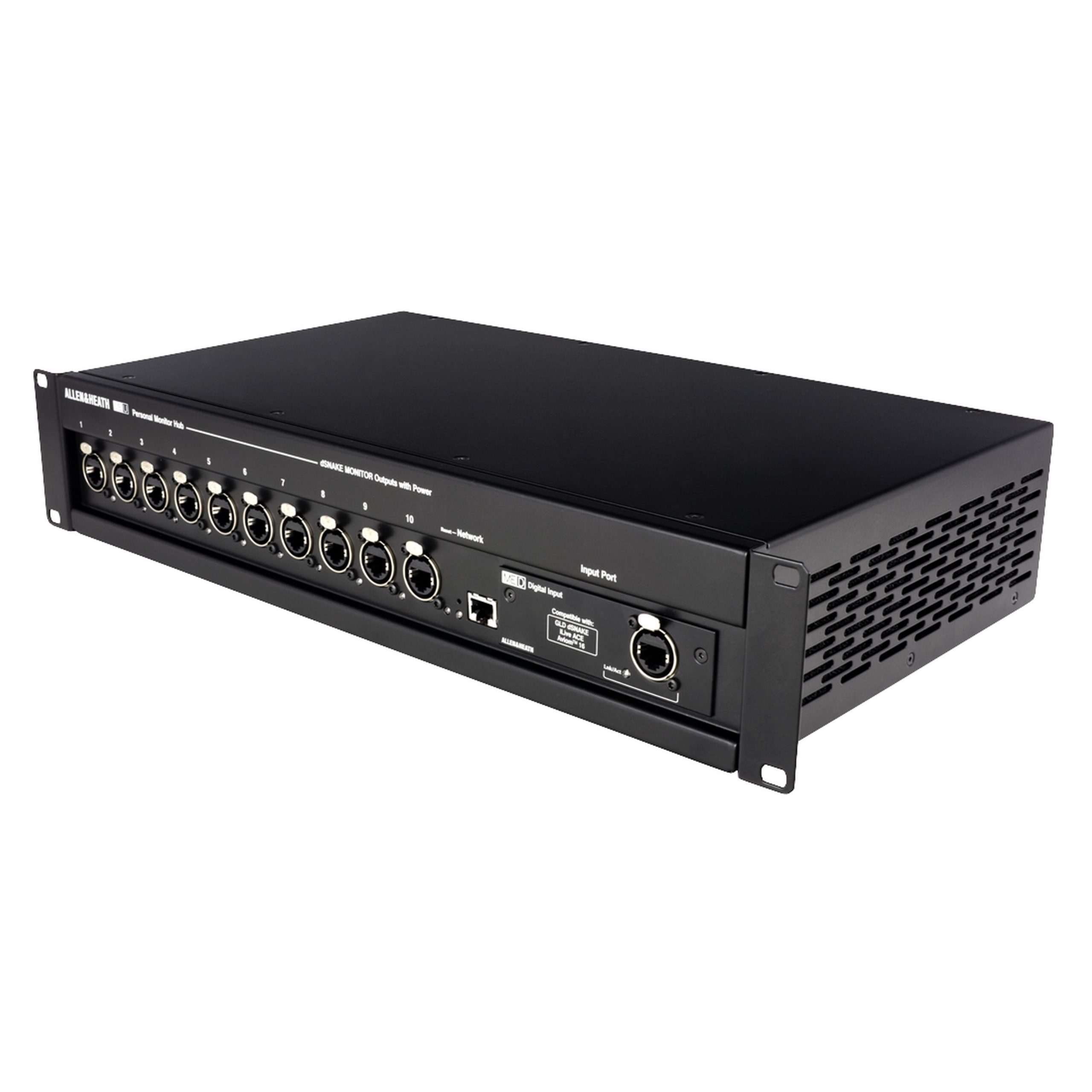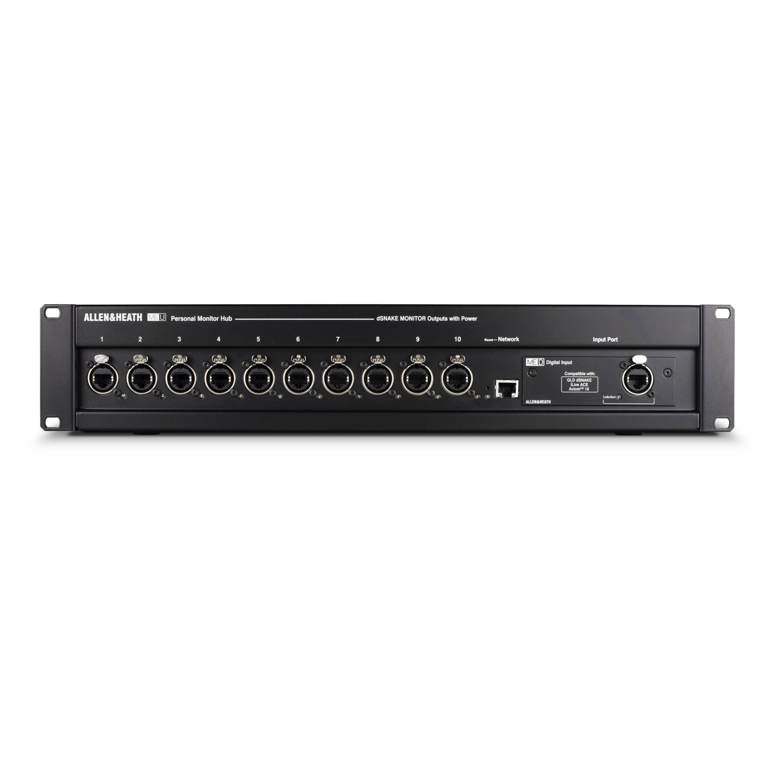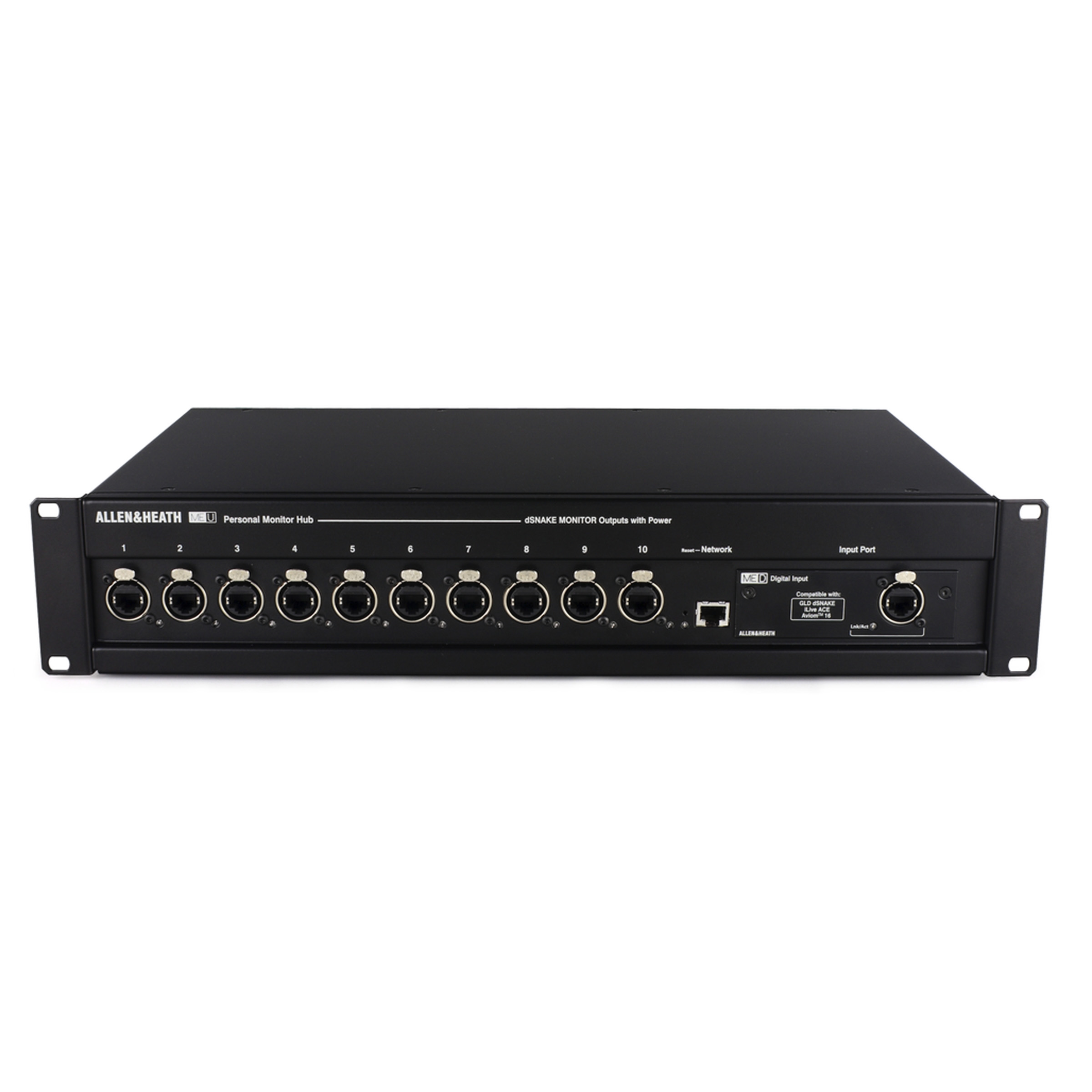 ME-U is a touring grade, 10 port PoE hub providing power and audio to multiple ME-1 and/or ME-500 personal mixers. ME-U’s default input card allows seamless integration with Allen & Heath dLive, SQ and Qu mixers. Fitting a Dante or MADI option card to the ME-U allows users of other pro digital mixer brands to feed up to 40 sources to ME-1s, or up to 16 sources to ME-500s.
