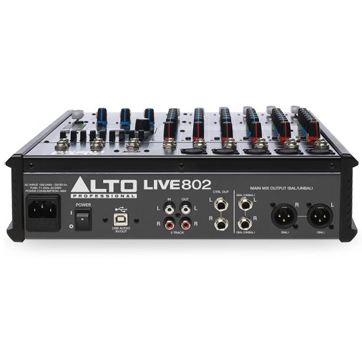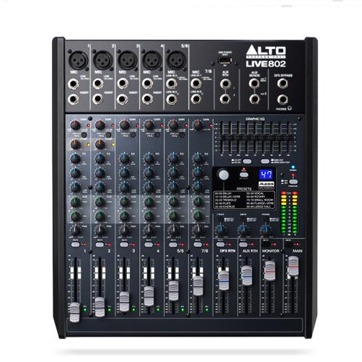 The Alto Professional Live 802 is a pro 8-channel, 2-bus mixer equipped with the tools you need to create the perfect mix. With flexible routing options and a multitude of onboard DSP tools, Live 802 fits the demands of nearly any live performance environment. It features 5 balanced XLR inputs with switchable phantom power, 3-band EQs for additional tonal shaping, two aux sends per-channel for external effects and monitoring, and a 9-band graphic EQ for main or monitor outputs. A headphone jack with an independent level control enables additional monitoring and mixing. 60mm faders with LED meters provide precise control and visual feedback for accurate, hands-on mixing. With its diverse connectivity options, Live 802 is ready for any event.