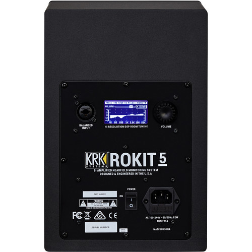 The single, black G4 ROKIT 5″ 2-Way Active Studio Monitor from KRK is the latest model from their popular monitor series. The ROKIT Generation 4 (G4) has been re-engineered from the ground up and offers updated features such as DSP-driven room tuning with 25 graphic EQ settings on an LCD combined with the included KRK app that helps minimize and correct problems in your acoustic environment. Matching drivers made with Kevlar ensure sonic integrity on every frequency and minimize listening fatigue, for professional studio, broadcast TV, and mixing applications.